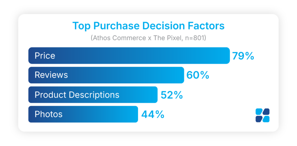 The Athos Commerce and Pixel survey confirms that AI agents are evaluating the same factors shoppers already care about, just faster and with less tolerance for gaps. The top four purchase decision factors among the 800+ shoppers surveyed were price (79%), reviews (60%), product descriptions (52%), and photos (44%).8 Every one of those is a product data problem. A human shopper who encounters a missing description might click away, while an agent eliminates you from the results before anyone sees your name.
